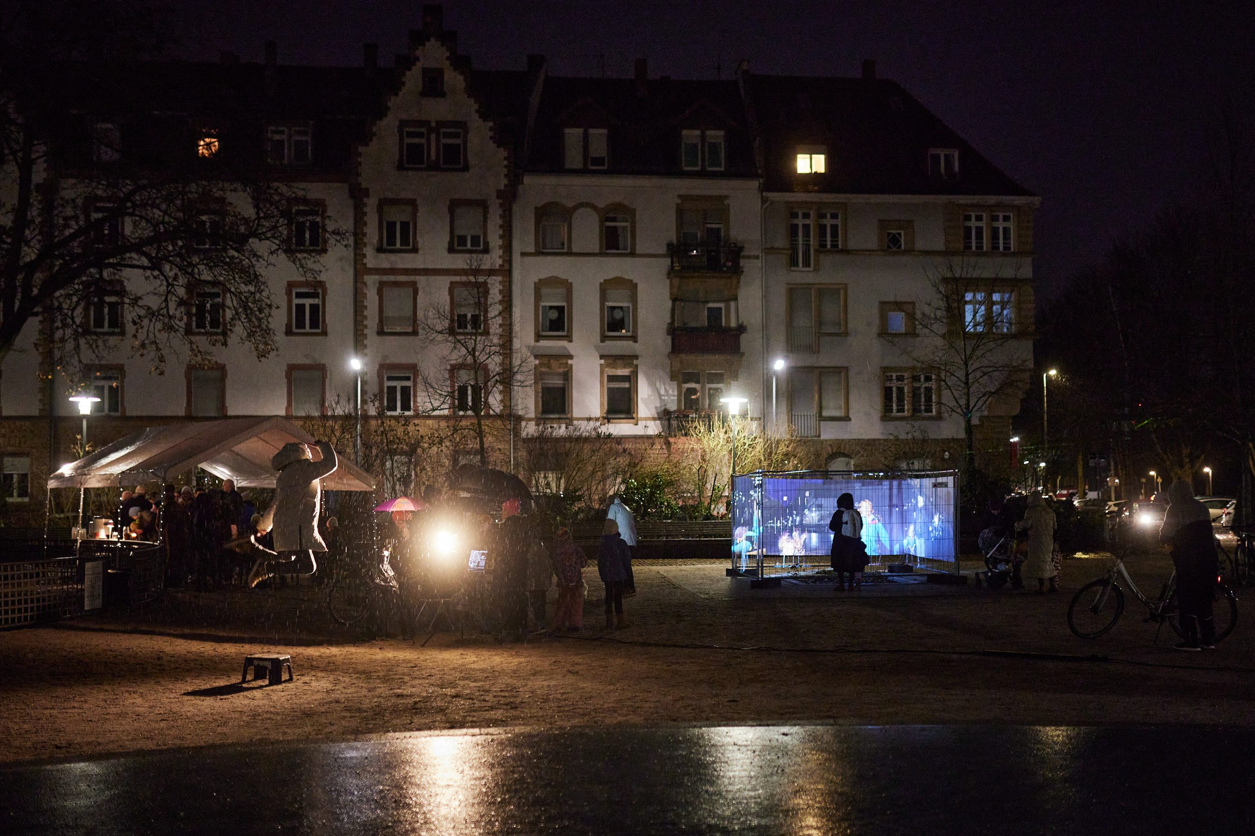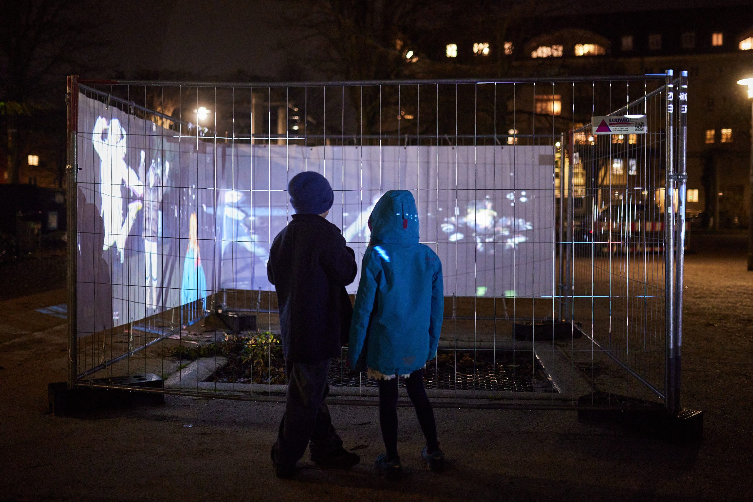 Das Projectionmapping auf Baustellenzäune verbindet Vergangenheit und Gegenwart zu einem neuen, poetischen Bild.