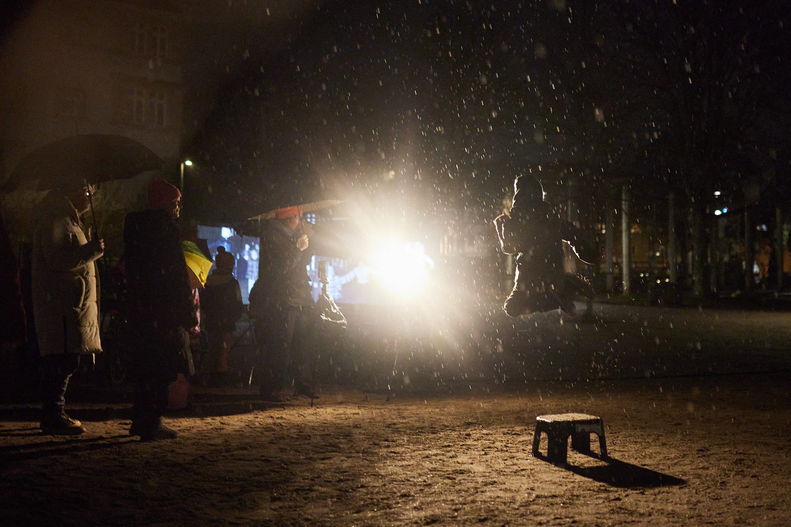 Zwischen Baustellenzäunen und urbanen Leerstellen ließ Jumpolin vergangene Momente wieder auftauchen: springende Körper, flüchtige Projektionen, Erinnerungen an verschwundene Orte und gemeinsames Erleben.